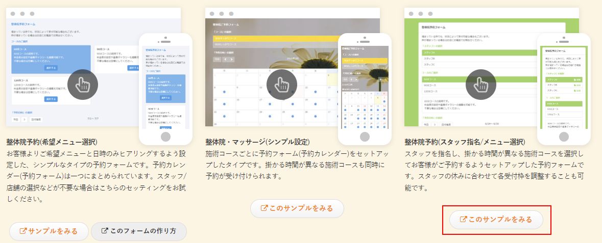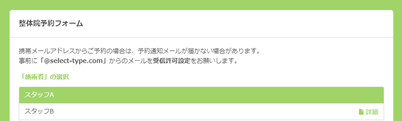 今回ご紹介します整体院・マッサージ向け予約フォームは「スタッフ指名タイプ」を使用して、