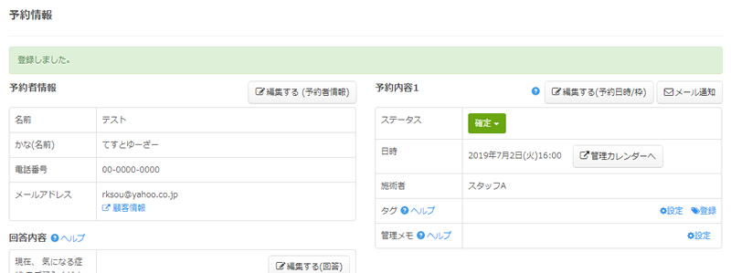 登録が完了すると、登録した予約情報の詳細画面が表示されます。