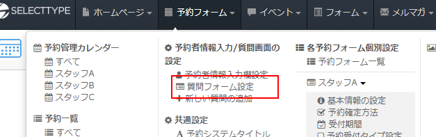 上部メニュー「予約フォーム」→「各予約フォーム個別設定/フォームタイトル/予約受付タイプ設定」をクリックします。
