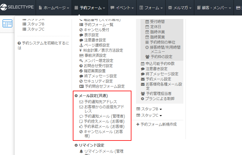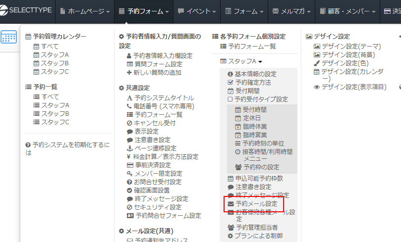 SELECTTYPEから予約に関するメールの設定は「予約メール設定」にて各種設定が行えます。