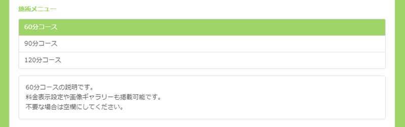 メニューには施術にかかる時間の設定やメニューラベルや説明など自由に設定が可能です。