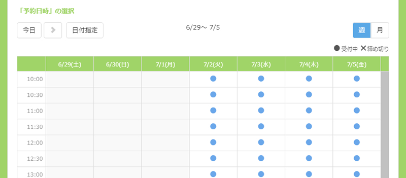 臨時休業日時が設定された日時の受付枠はカレンダー上で非表示になります。