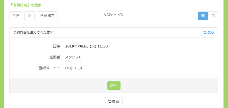 日付を選択すると確認画面が表示され、次へをクリックします。