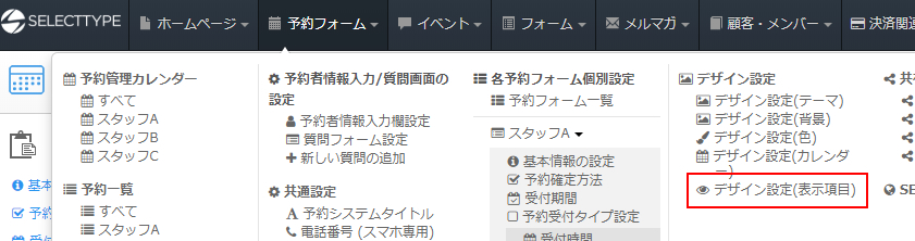 上部ヘッダーより「予約フォーム」→”デザイン設定”内の「デザイン設定(表示項目)」とクリックします。