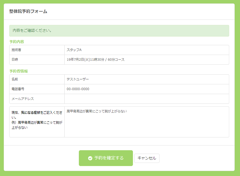 予約の内容、予約者の情報に問題がなければ確定し送信します。