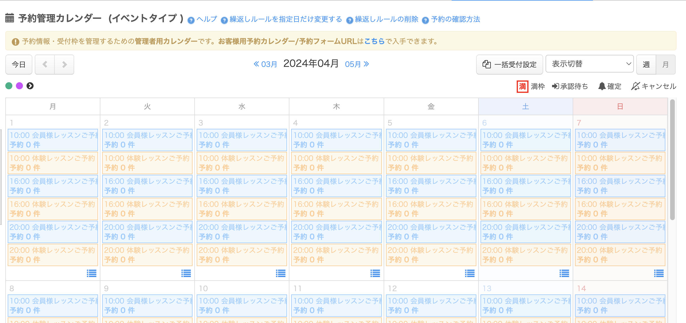 予約管理用のカレンダーが表示されます。個別に予約枠を選択し、受付を停止できます。