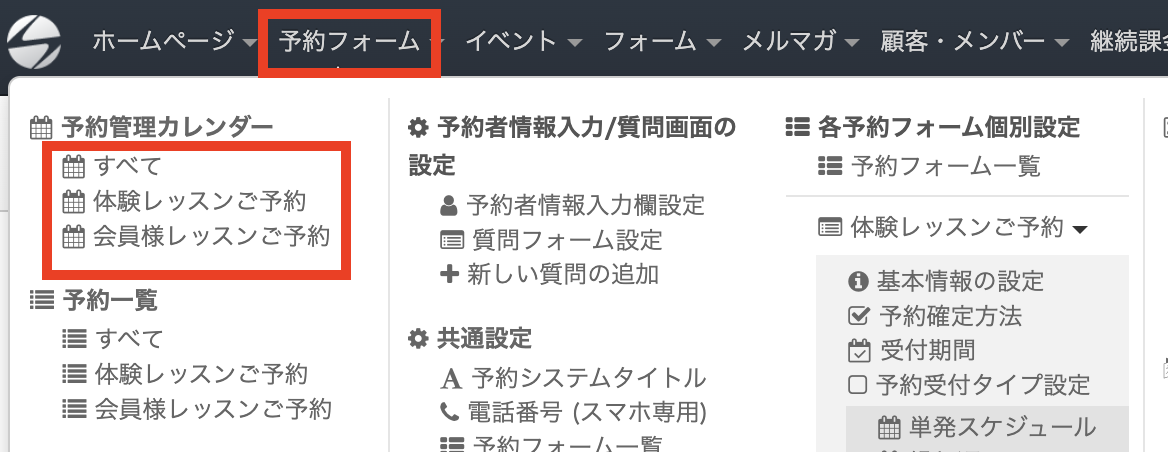 予約の代行登録を行う場合は、ヘッダーの「予約フォーム」をクリックし、その後「予約管理カレンダー」を選択します。