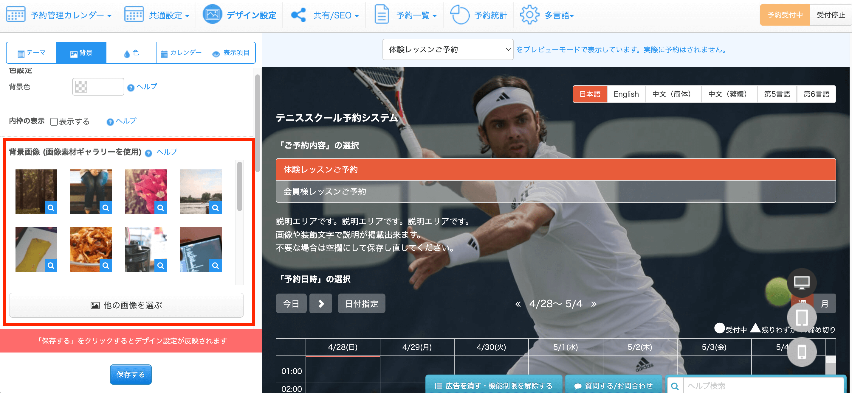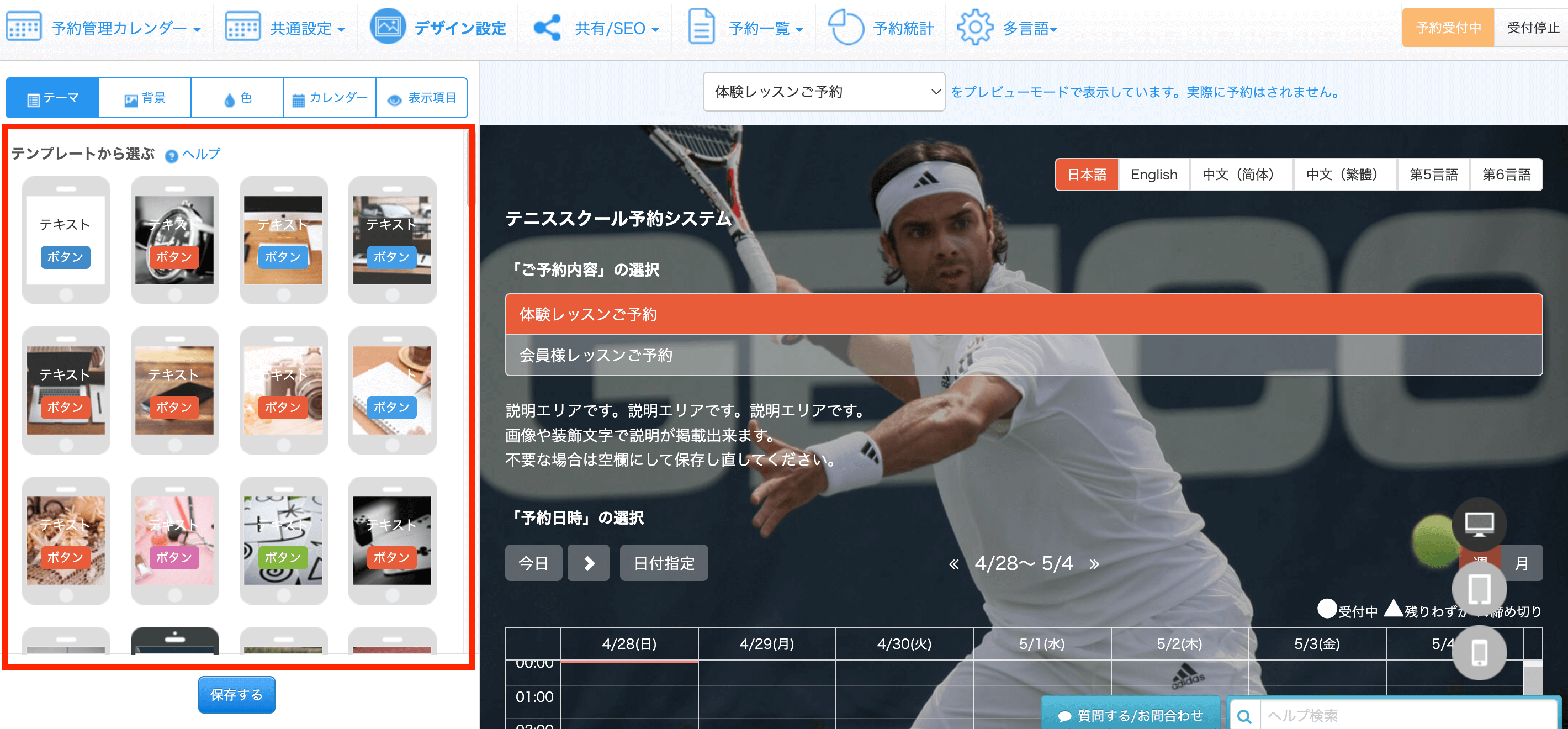 画面左側にあるデザインテーマを選択し、予約フォームのデザインを簡単に変更できます。