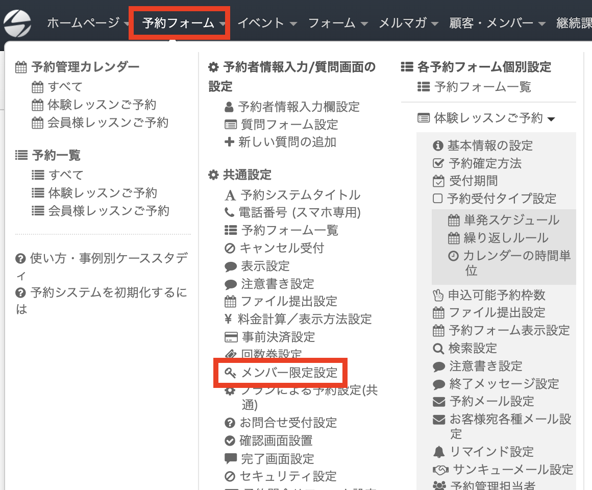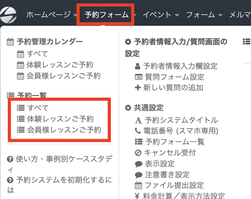今回紹介するテンプレートでは、予約フォームが体験レッスン用と会員様レッスン用の2種類が設定されています。体験レッスン用と会員様レッスン用で異なる内容のリマインドメールを設定する、といった運用が可能です。