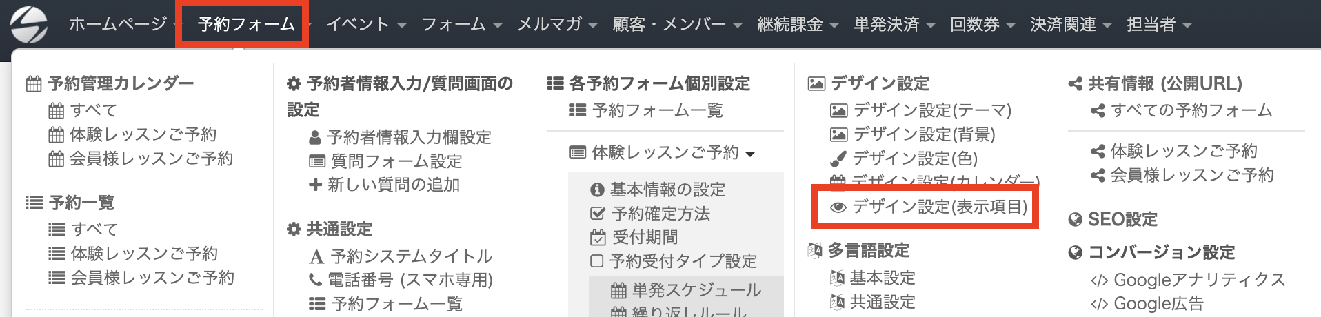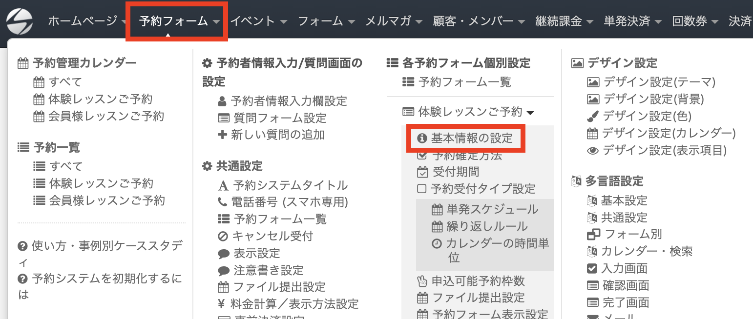 基本情報を変更するには、ヘッダーにある「予約フォーム」をクリックした後、「基本情報の設定」を選択してください。
