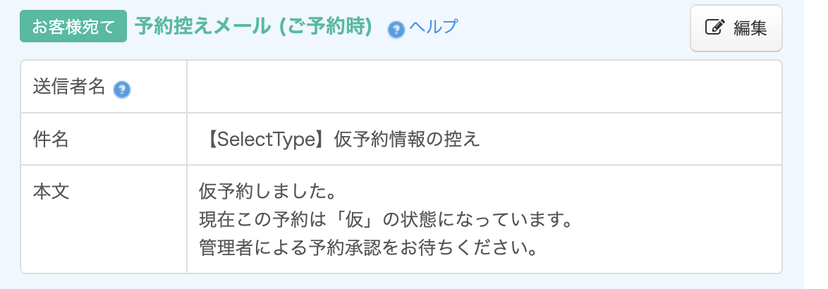 お客様宛の予約控えメール(ご予約時)の「編集」をクリックすると、予約控えメールの内容の編集を行えます。