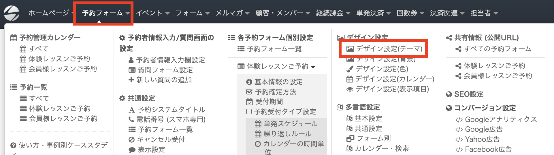 デザインテンプレートを変更する際は、ヘッダーにある「予約フォーム」をクリックし、「デザイン設定(テーマ)」を選択します。