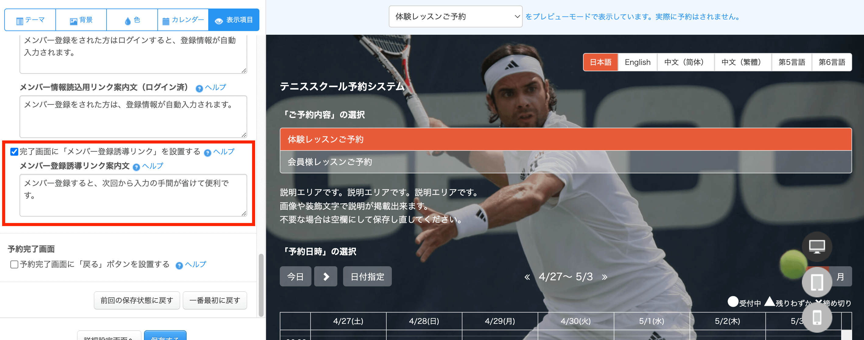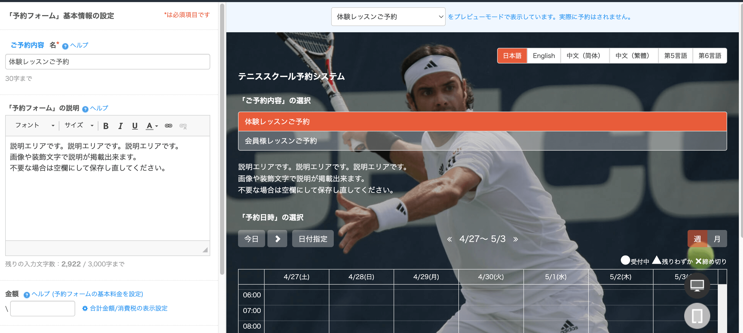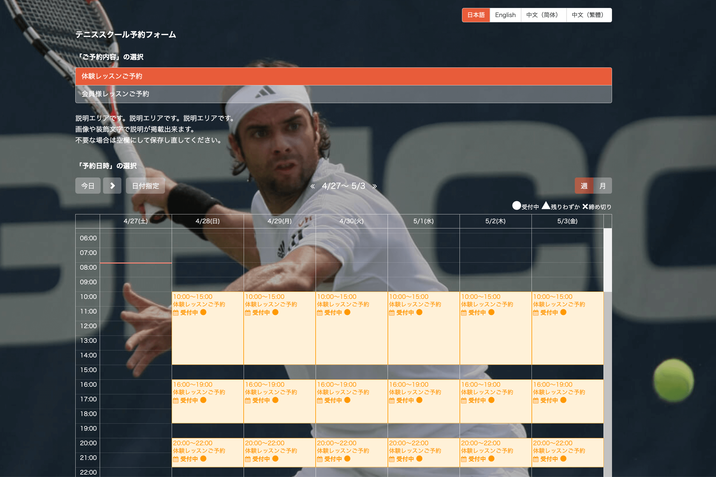 テニススクールの予約システムのテンプレートを用いることで、会員向けレッスンと体験レッスンの予約内容を別々にセットアップし、オンラインでの予約受付を簡単に開始できます。