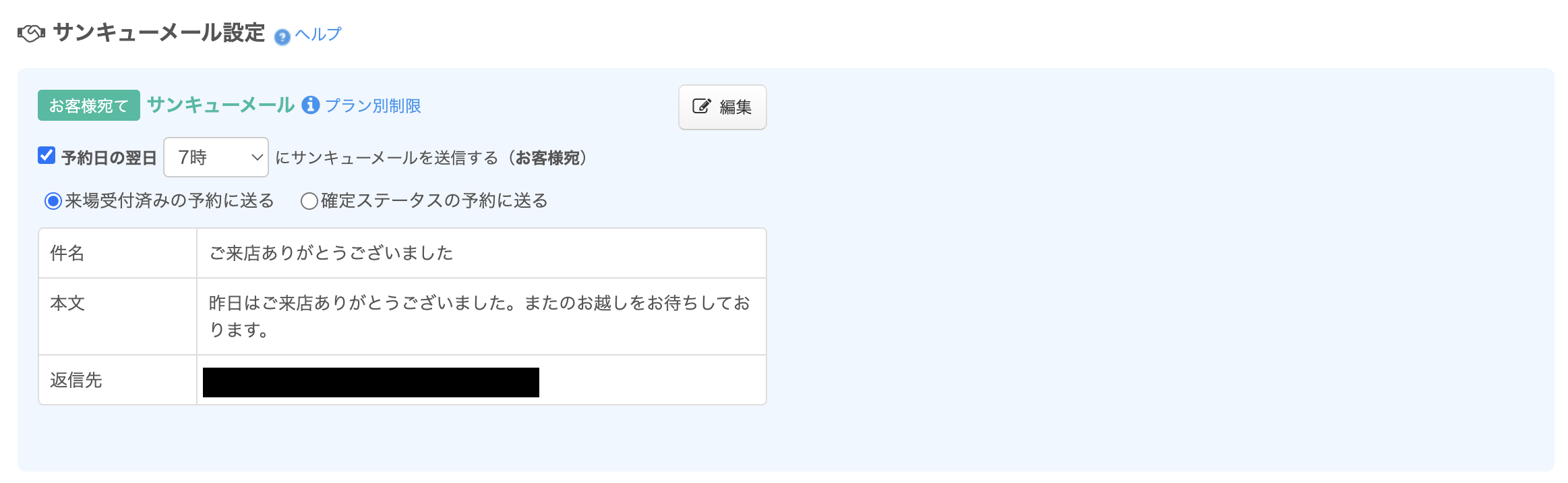 予約翌日の7時にサンキューメールが送信されるように設定されました。