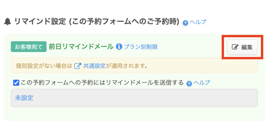 お客様宛の前日リマインドメール欄の「編集」をクリックすると、設定画面が表示されます。