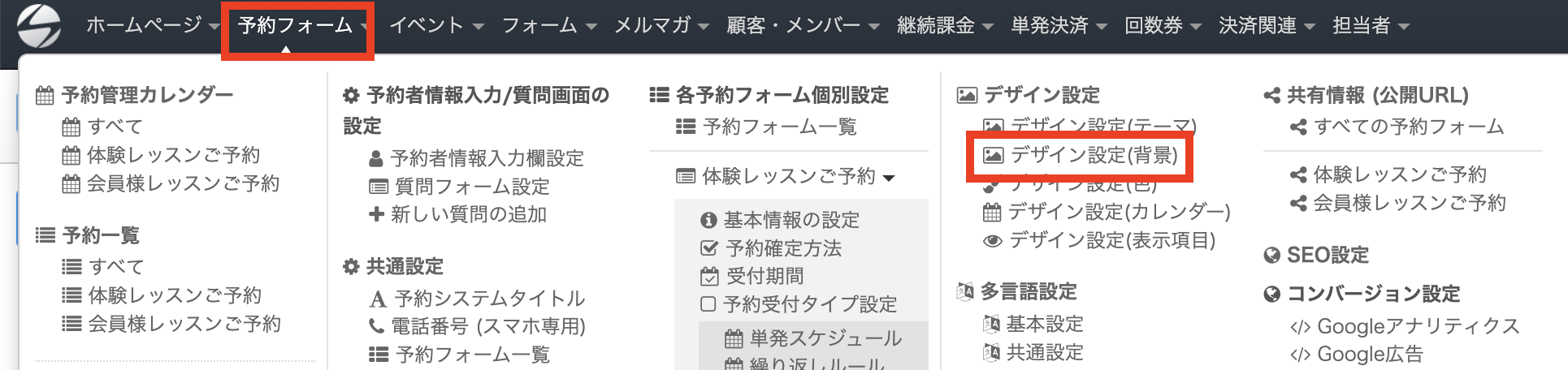 変更する際は、ヘッダーの「予約フォーム」をクリックし「デザイン設定(背景)」を選択します。
