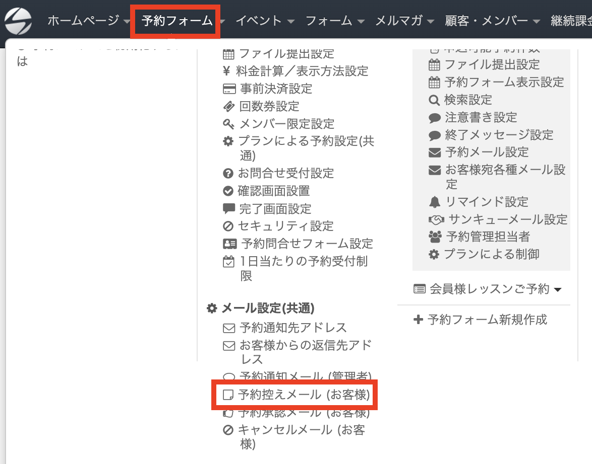 上記の予約控えメールの編集を行う際は、ヘッダーの「予約フォーム」をクリックし「予約控えメール(お客様)」を選択します。