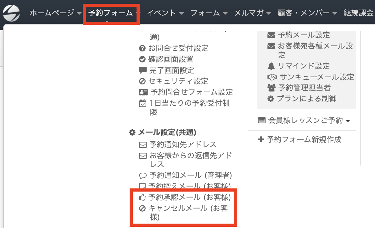 予約承認メールと予約キャンセルメールの内容を変更する際は、ヘッダーの「予約フォーム」をクリックし「予約承認メール(お客様)」または「キャンセルメール(お客様)」を選択します。