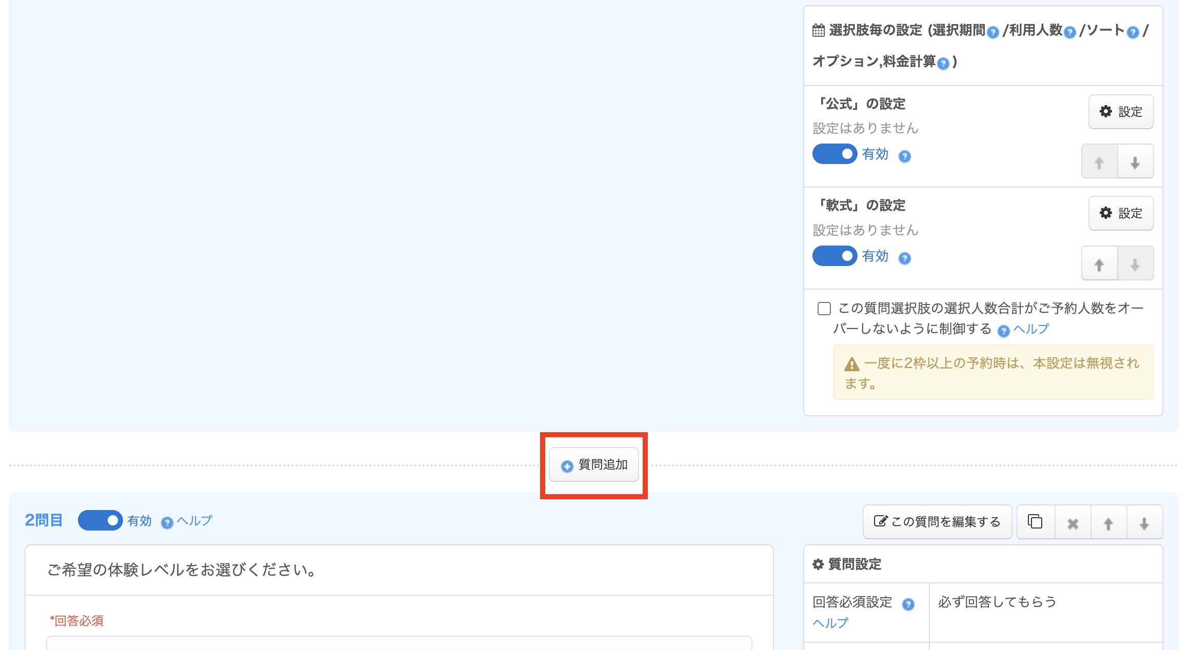 質問欄を新たに追加するには、「質問追加」をクリックしてください。