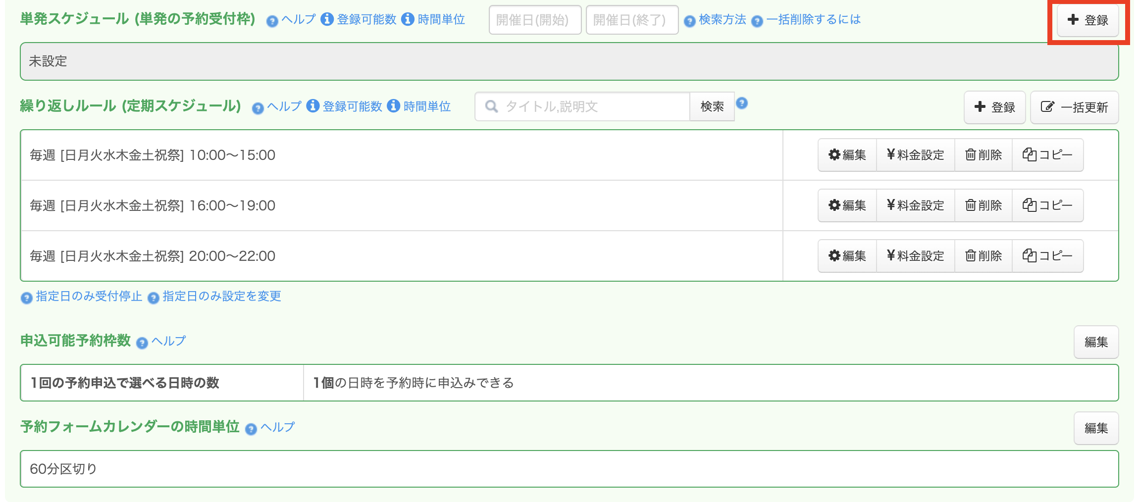 初期設定では、単発スケジュールは登録されていません。単発スケジュールを追加するには、「登録」ボタンをクリックしてください。