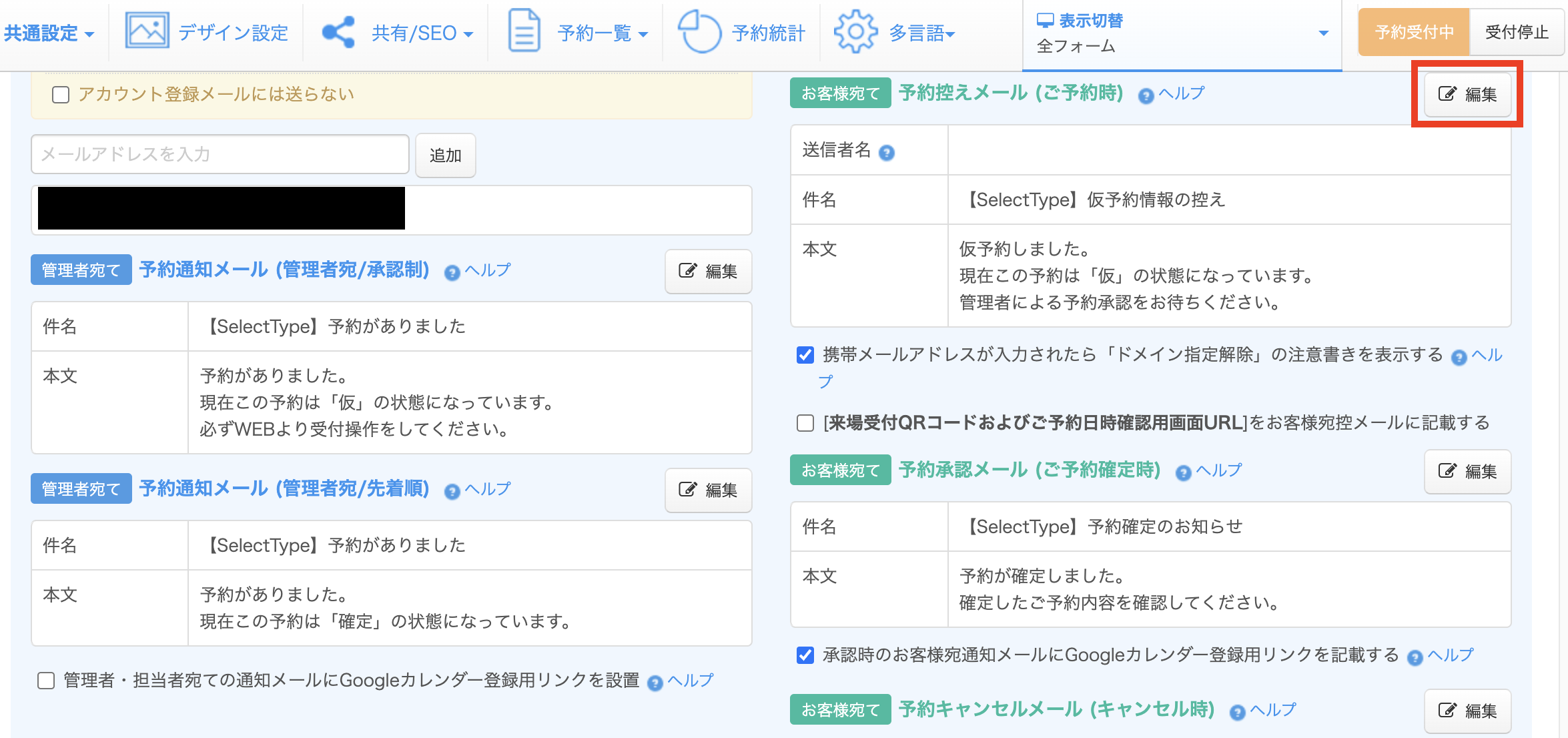 予約フォームで予約をしたお客様に自動送信する「予約控えメール」の設定