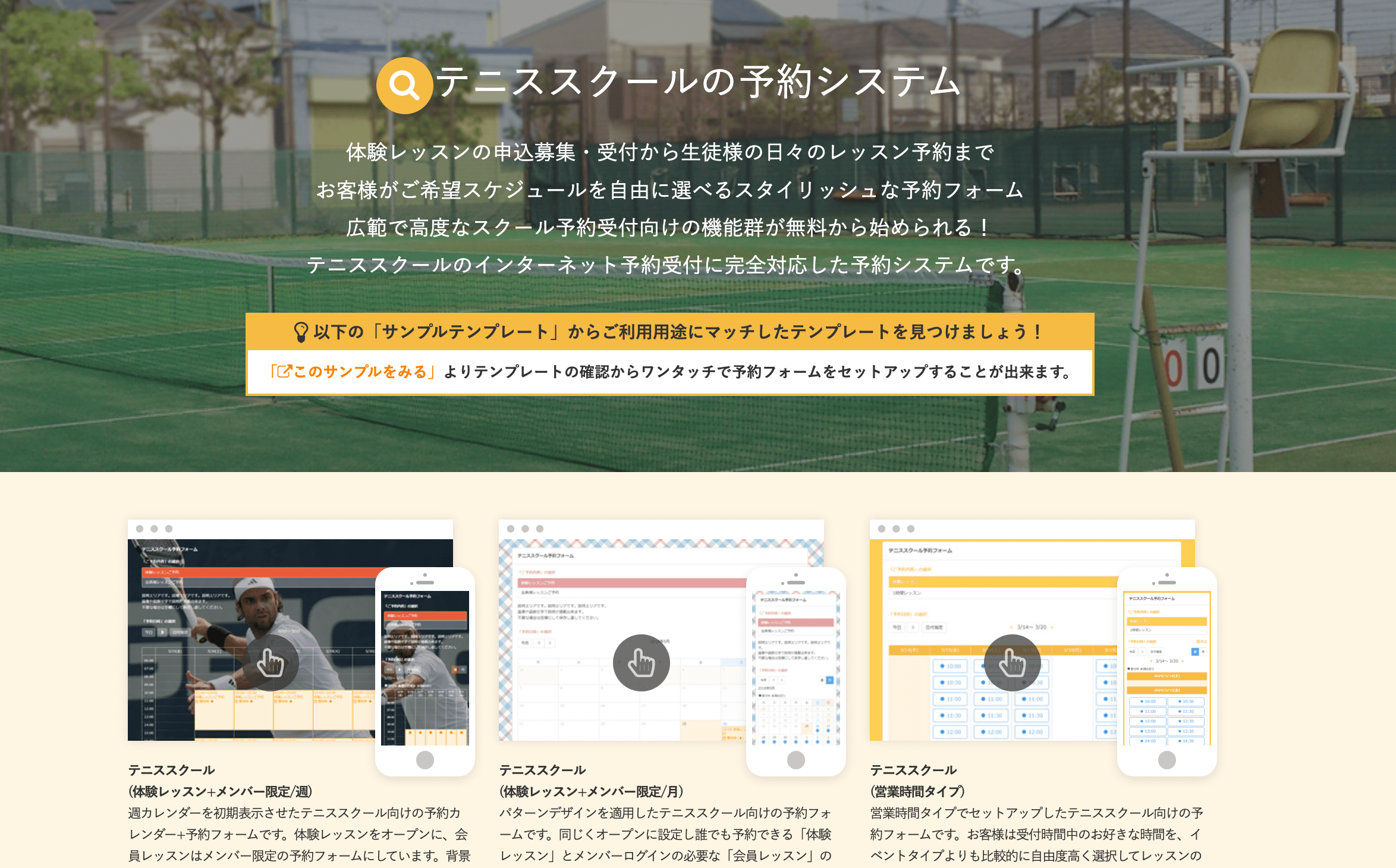 テニスコートの予約システムを構築する場合、以下のテンプレート紹介ページに掲載されているものから選択してください。