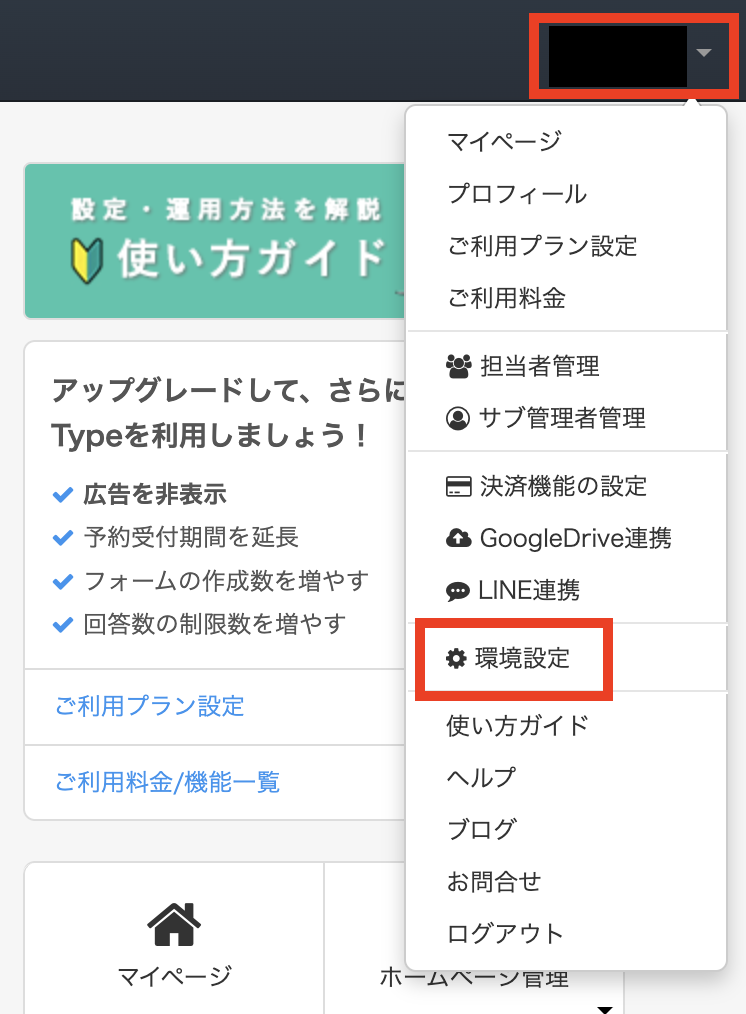 返信先アドレスを登録する際は、ヘッダーの右端にあるメニューをクリックし、「環境設定」を選択すると、設定画面が開きます。