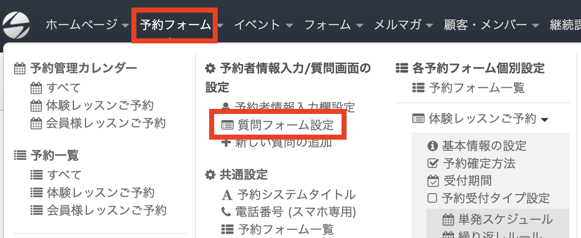 質問を設置する際は、ヘッダーの「予約フォーム」をクリックし、「質問フォーム設定」を選択します。