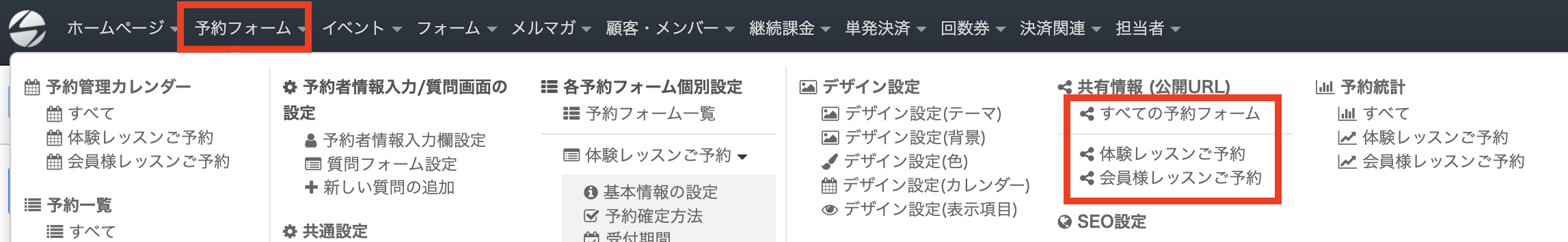 予約フォームのURLを確認するには、ヘッダーの「予約フォーム」をクリックしURLを確認したい予約フォームを選択します。