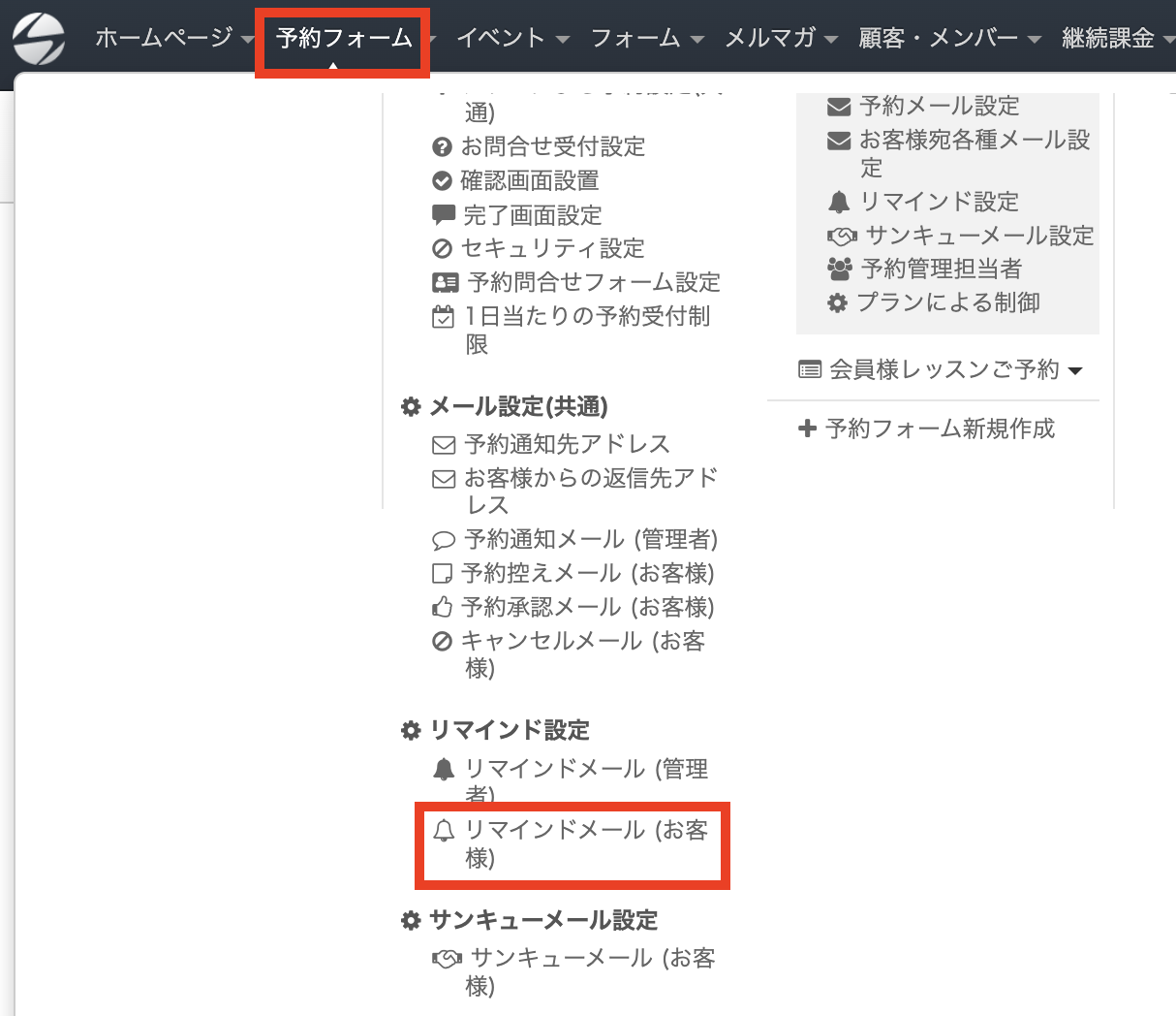 ヘッダーの「予約フォーム」をクリックし「リマインドメール(お客様)」を選択します。