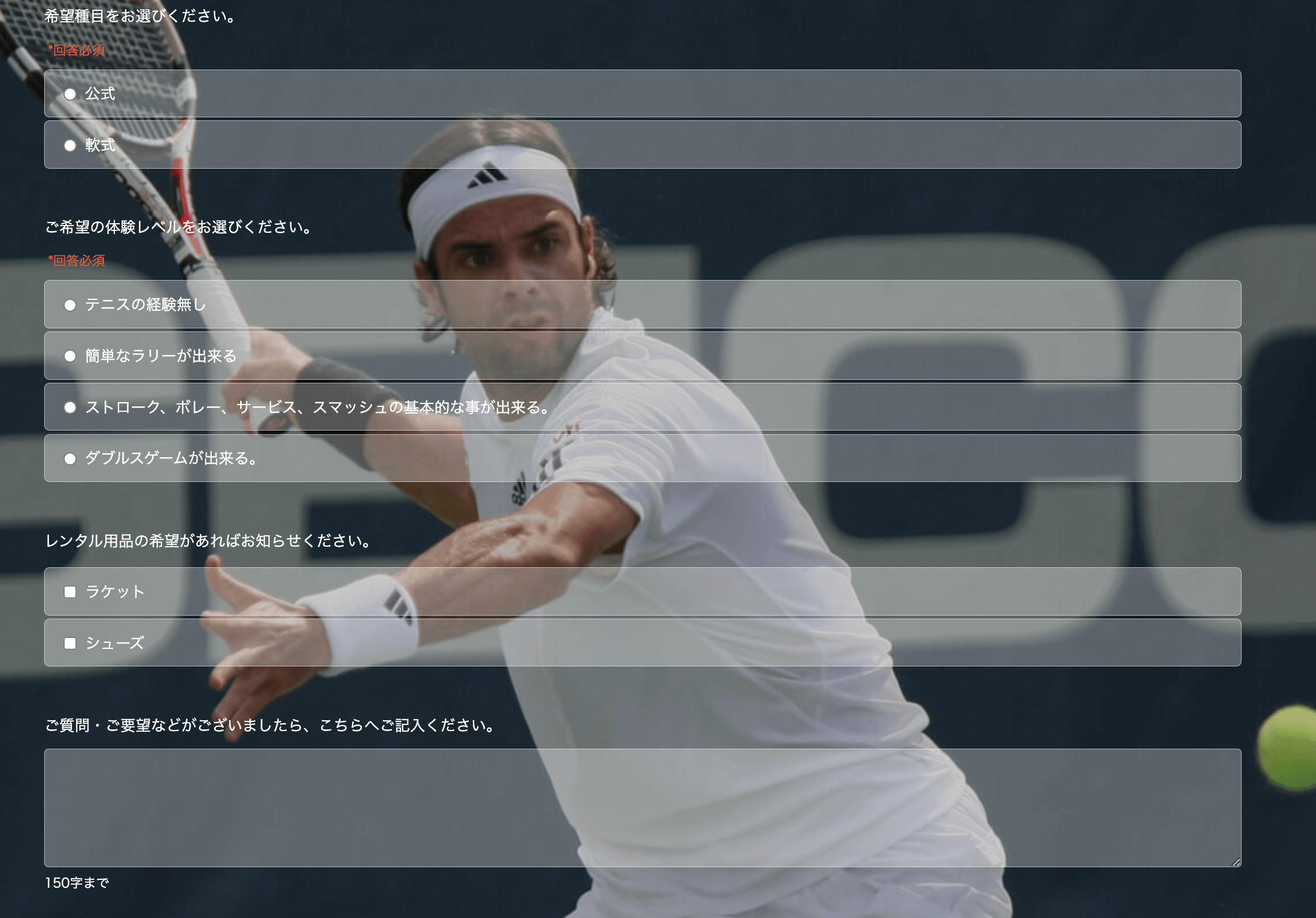 SelectTypeの予約フォームを利用すると、テニススクールの予約を希望するお客様に、特定の質問項目に答えてもらい、レッスン時に必要な情報を収集できます。予約フォームに表示される質問項目は、必要に応じてカスタマイズすることが可能です。