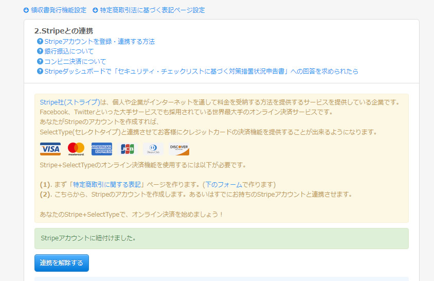 また、既にStripeアカウントとSelectTypeアカウントの連携がお済みの場合にはこちらの手続きは不要ですので