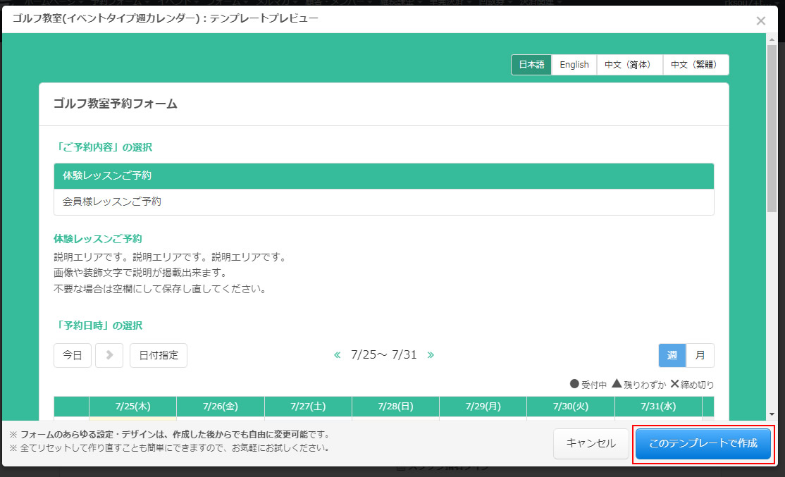 「テンプレートプレビュー」で予約フォームを確認することができます。