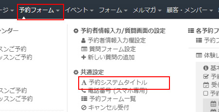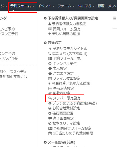 上部メニュー「予約フォーム」⇒「共通設定/メンバー限定設定」をクリックします。