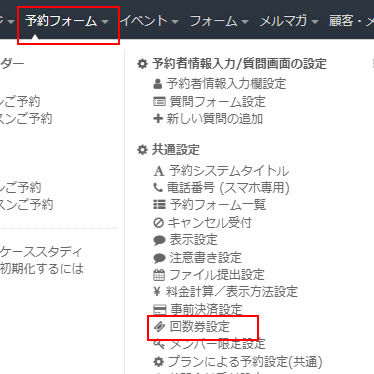 上部ヘッダーの「予約フォーム」→共通設定内の「回数券設定」をクリックします。
