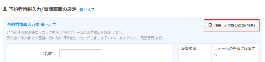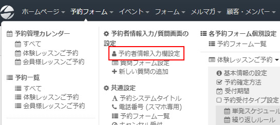 ヘッダーの「予約フォーム」をクリックし、「予約者情報入力欄設定」を選択してください。