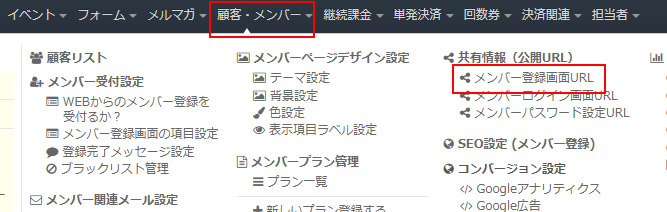 完成した登録フォームのURLは「メンバーページ共有情報」画面から入手することが出来ます。