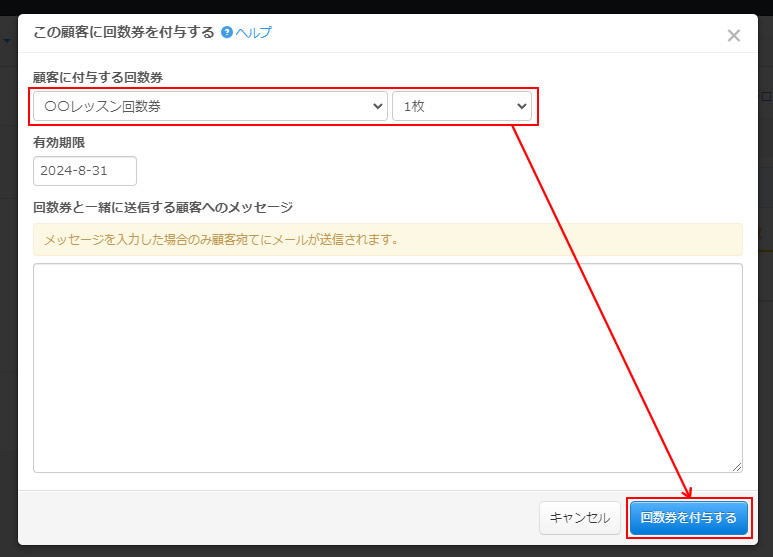 メッセージ欄に顧客へのメッセージを入力した後に「回数券を付与する」をクリックすると、回数券を付与した顧客にメールが送信されます。
