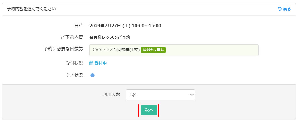 予約時にメンバーログイン済みの状態で指定された回数券を所有していれば予約を進めることが出来るようになります。