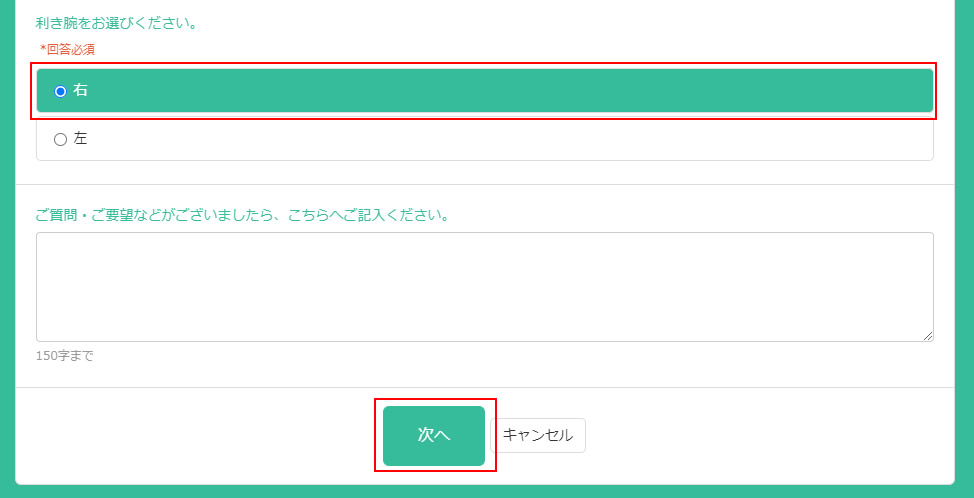 初期設定では、利き腕をヒアリングする質問やご質問・ご要望をヒアリングするフォームが設定されています。