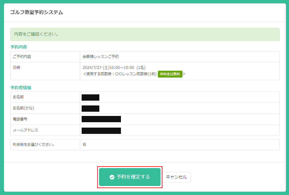最後に確認画面をはさんで「予約を確定する」をクリックして予約が完了します。