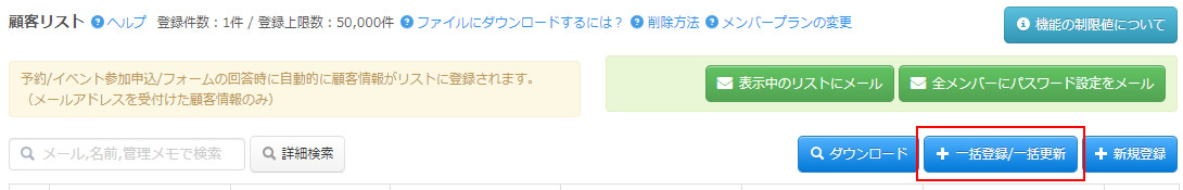 顧客リストページの右上部、「一括登録/一括更新」クリックします。
