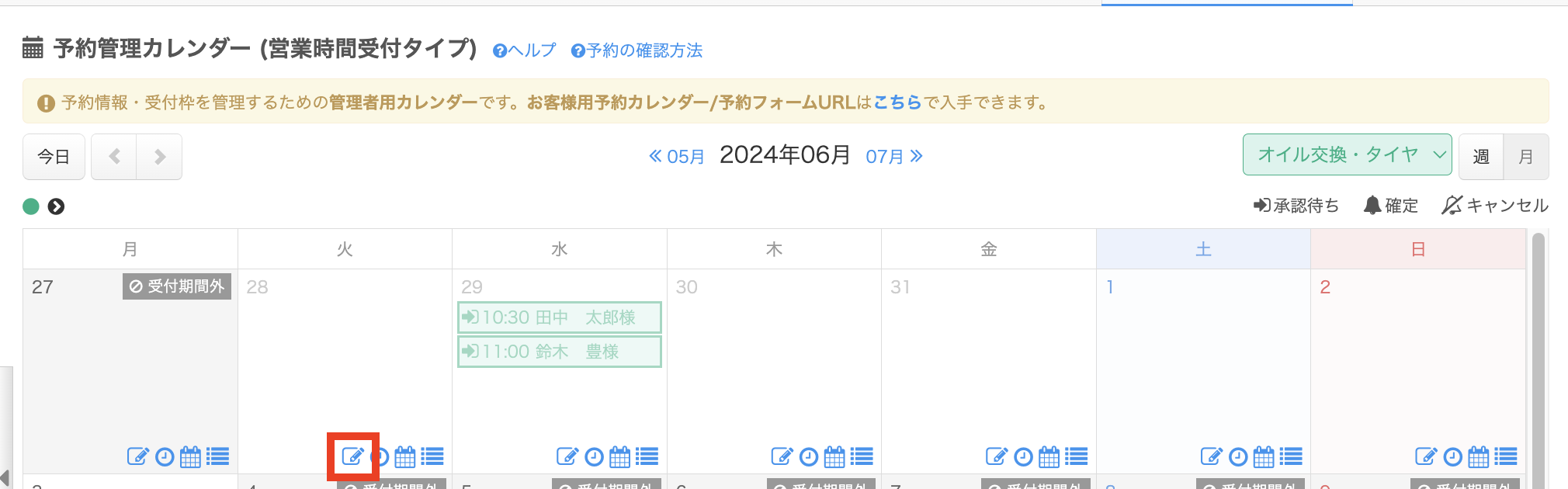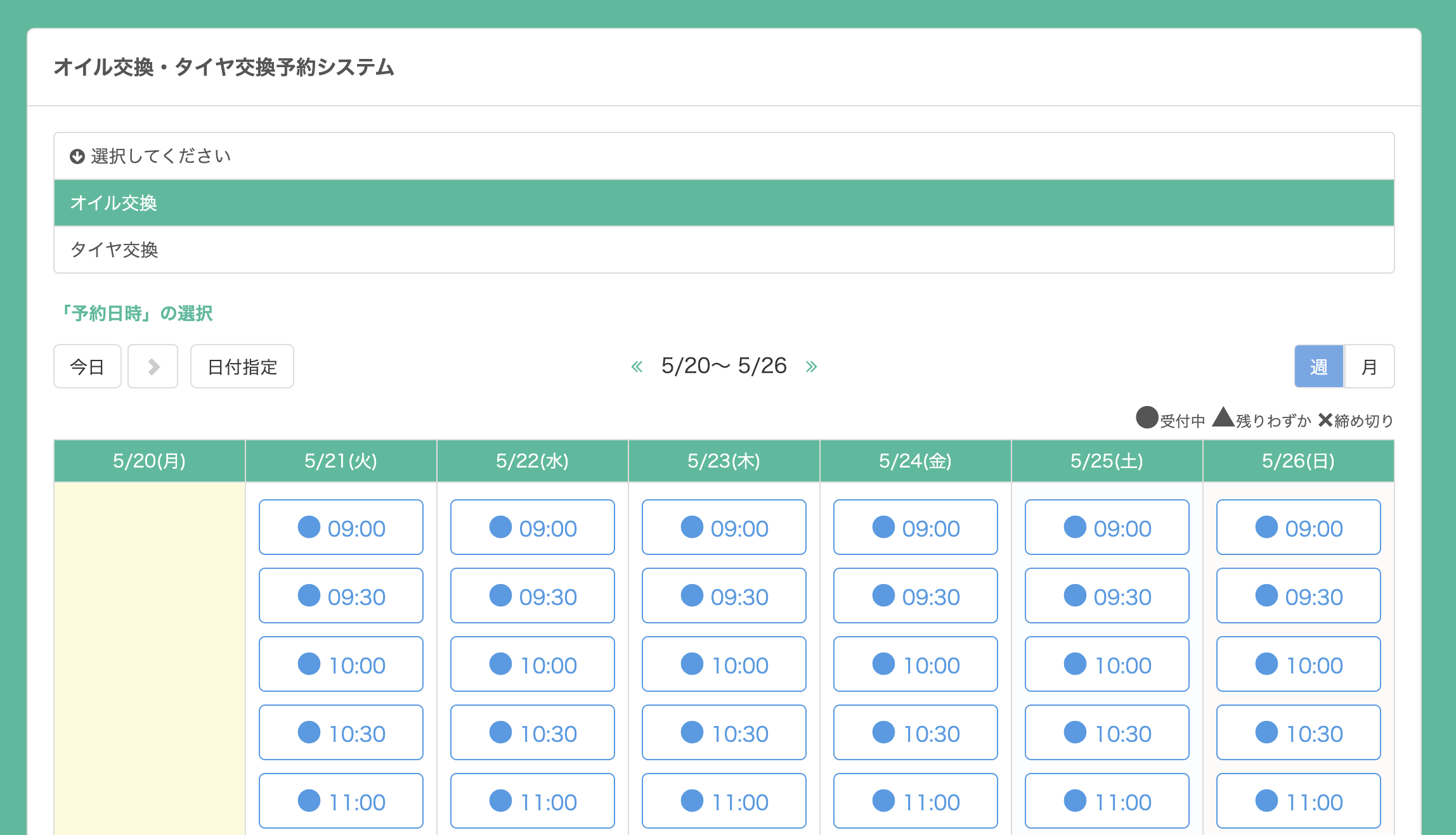 初期設定では、オイル交換とタイヤ交換を合わせて3枠が設定されており、同じ時間帯に3件を超える予約は自動的に受け付けません。