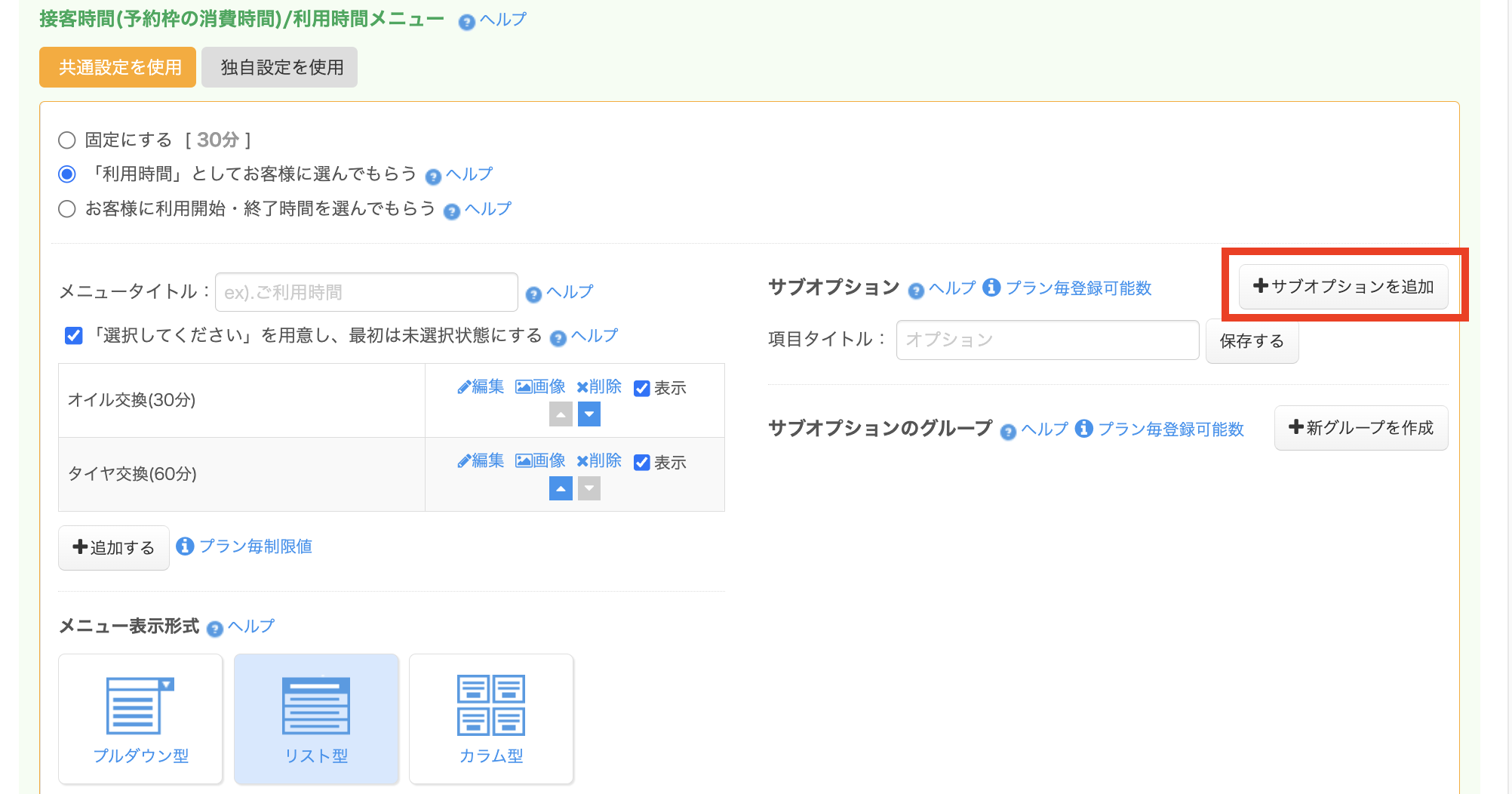 利用時間メニューにサブオプションを設定することで、お客様が追加サービスを選択することができるようになります。
