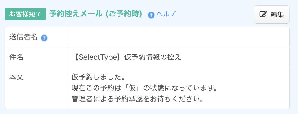 お客様宛の予約控えメール(ご予約時)の「編集」をクリックすると、予約控えメールの内容の編集を行えます。