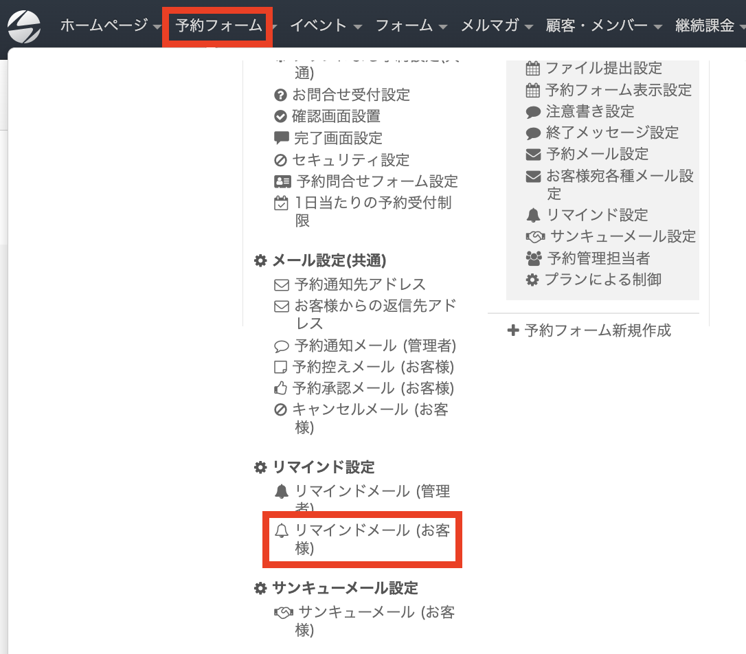 リマインドメールを設定する際は、ヘッダーの「予約フォーム」をクリックし「サンキューメール(お客様)」を選択します。