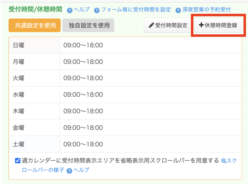 初期設定では、受付時間は9:00〜17:30となっており、休憩時間は設定されていません。