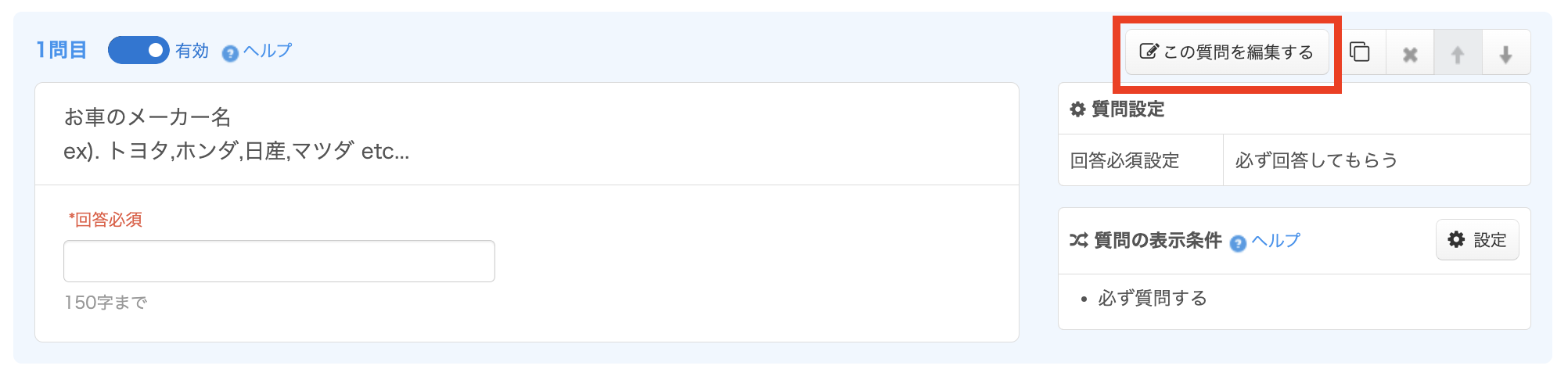 質問を変更する場合は、変更したい質問の「この質問を編集する」をクリックすると、設定画面が表示されます。
