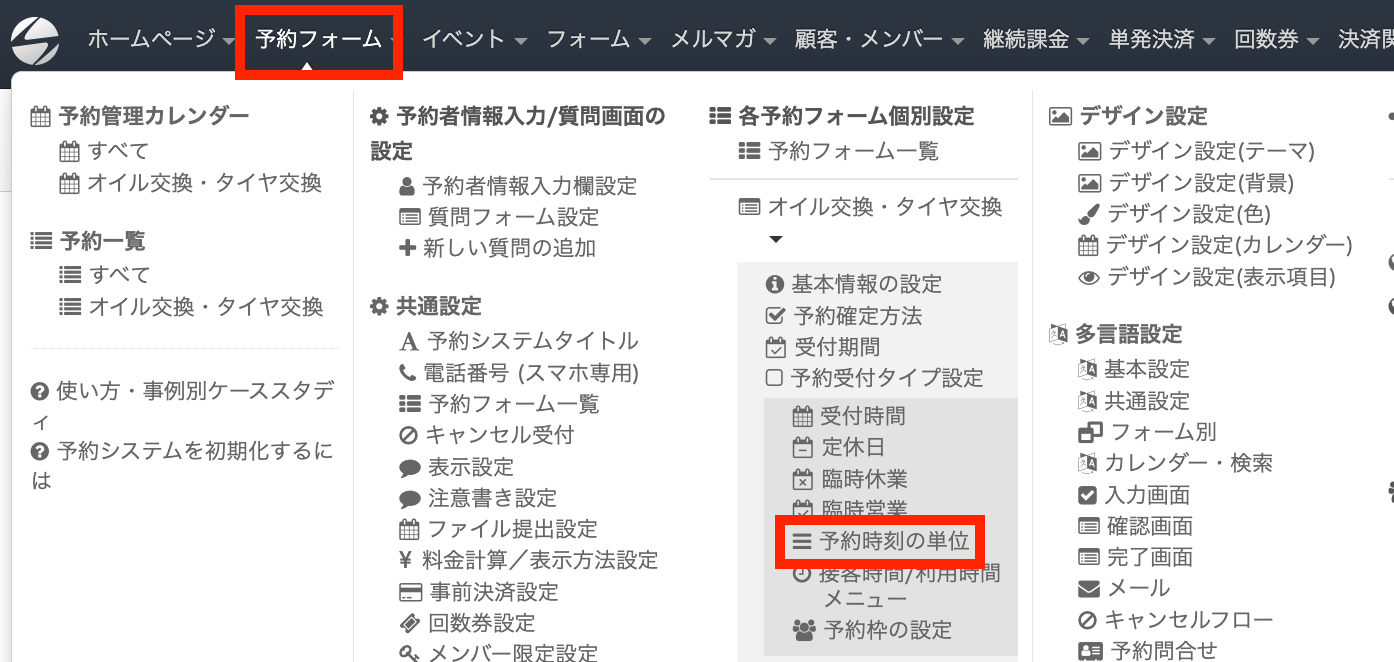 予約時刻の単位を変更する際は、ヘッダーの「予約フォーム」をクリックし「予約時刻の単位」をクリックします。