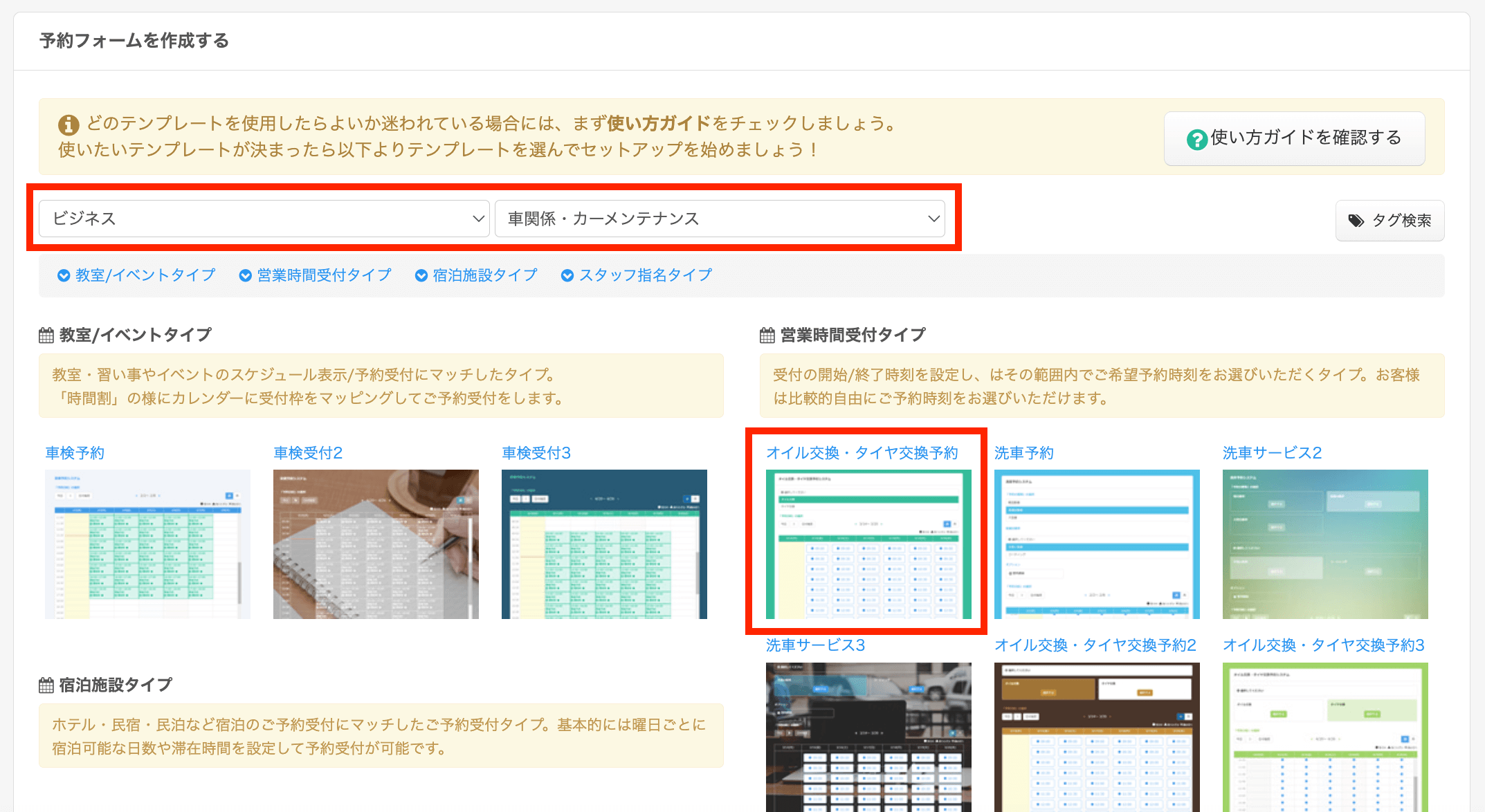 タイヤ交換・オイル交換の予約システムを構築する場合は、以下のテンプレート紹介ページに掲載されているテンプレートから選択してください。
